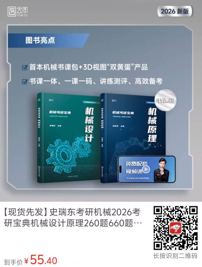 【京东】【现货先发】史瑞东考研机械2026考研宝典机械设计原理260题660题辅导书及全真试题精解机械考研指南考点基础强化指导书题库习题集速背手册价保阅读狂欢节 【2件套】史瑞东机械设计+机械原理(分批)———————到手价:¥55.40———————抢购链接:https://u.jd.com/W6gpIxV